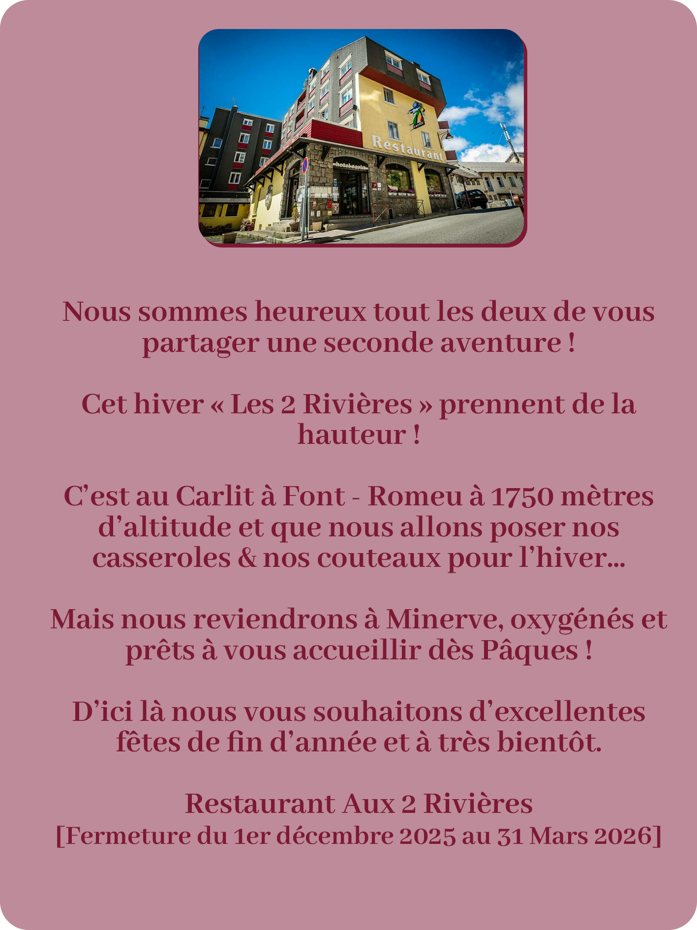 Notre restaurant « Aux 2 Rivières » est situé à la pointe de l’éperon rocheux avec une vue imprenable donnant sur le confluent Cesse & Brian et la malvoisine.
